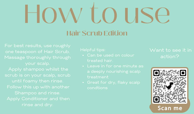 For best results, wet your hair, place 1 teaspoon of scrub into the palm of your hand and massage through. Gently rub your favorite shampoo into hair with scrub still present, then rinse out. Follow with another shampoo and conditioner.