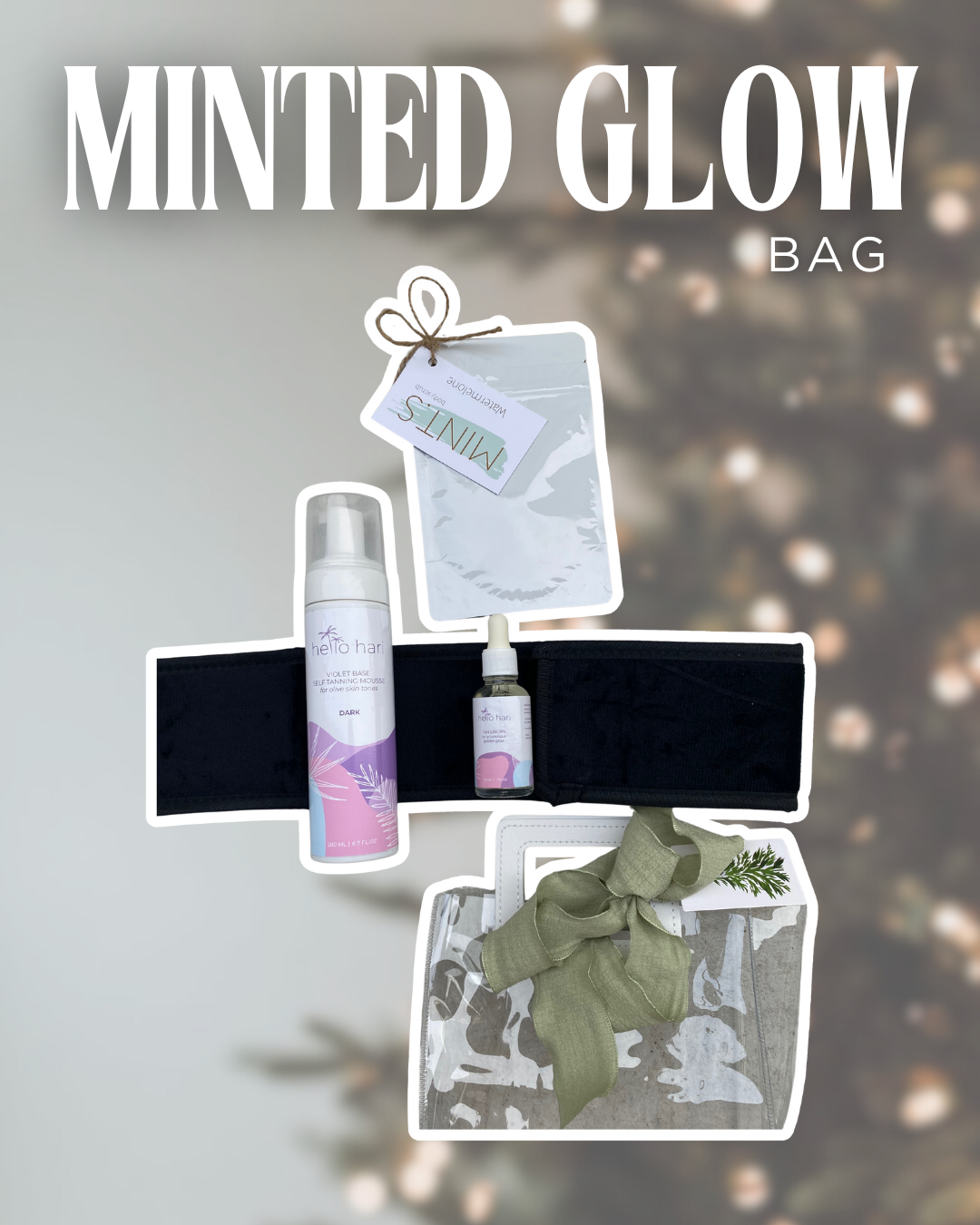 This limited-edition Minted Glow bag includes everything you need for a golden finish — tanning mousse, back applicator, tanning mitt, mini body scrub, and face tanning serum.